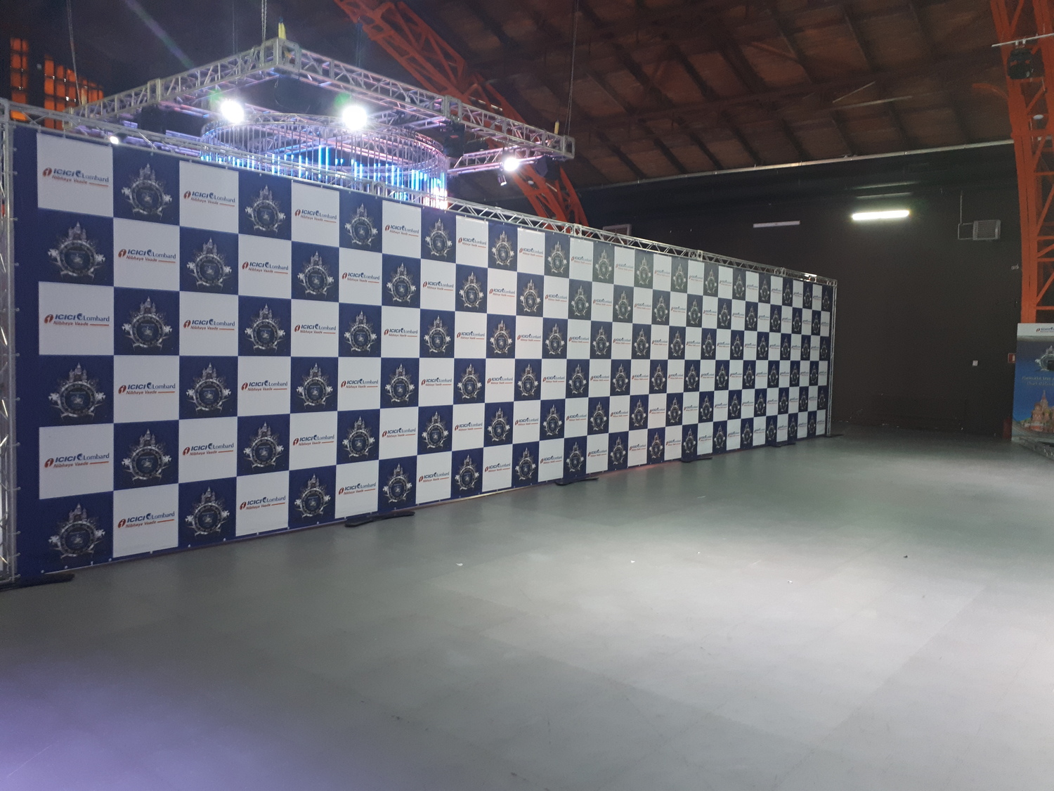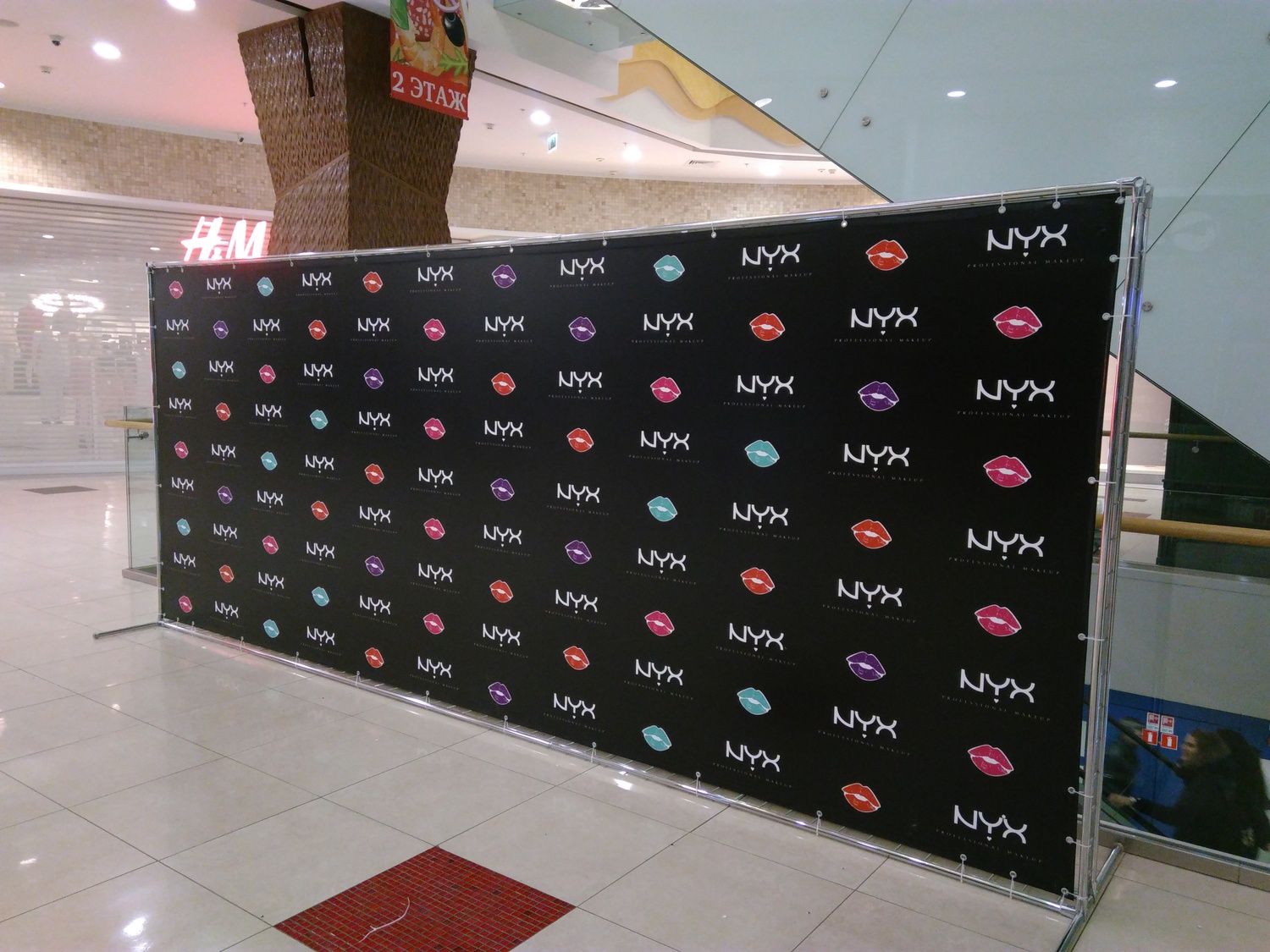 Конструкция из двойных хромированных труб усиливающих каркас тем самым конструкцию можно устанавливать на улице и делать больших размеров. Данный тип пресс волла позволяет скрыть элементы каркаса.